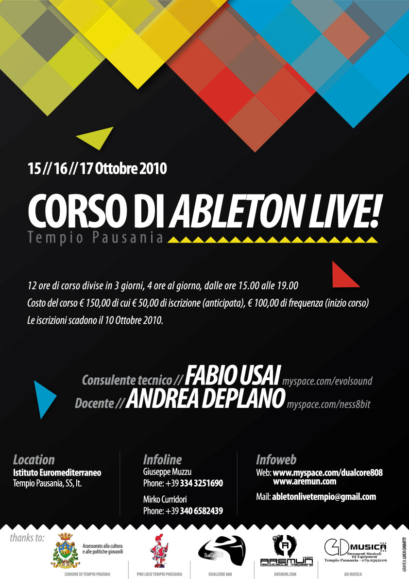 Un week end (dal 15 al 17 Ottobre 2010) a Tempio Pausania, per frequentare il corso del software audio, utilizzato dai maggiori esponenti della musica elettronica! Lo scopo principale è fornire le conoscenze teorico-pratiche fondamentali di Ableton Live. Il corso affronterà le questioni tecniche fondamentali e si svilupperà attraverso delle dimostrazioni pratiche delle possibili applicazioni in ambito di produzione con un occhio di riguardo alle esigenze del music producer e a quelle del music player.